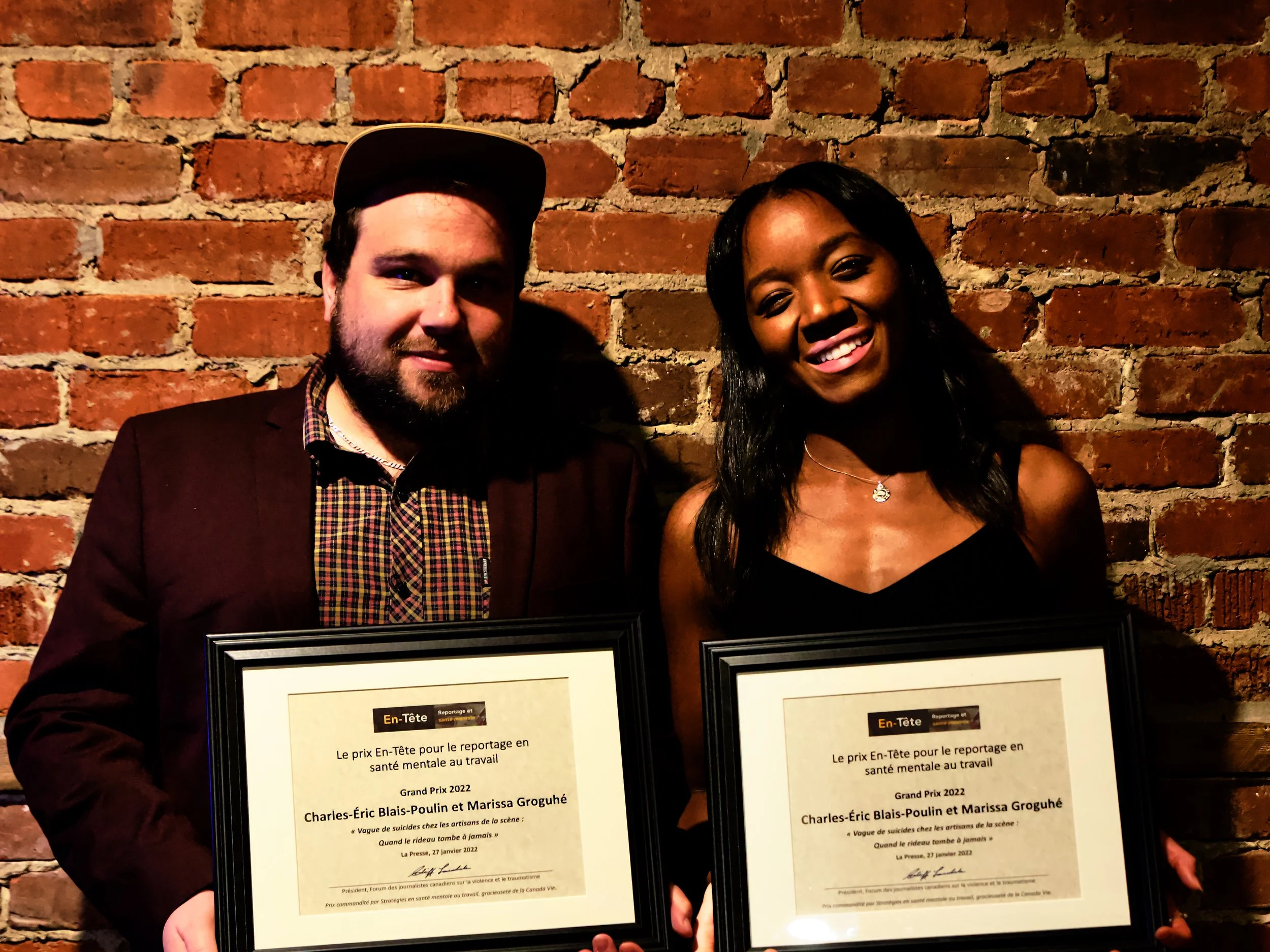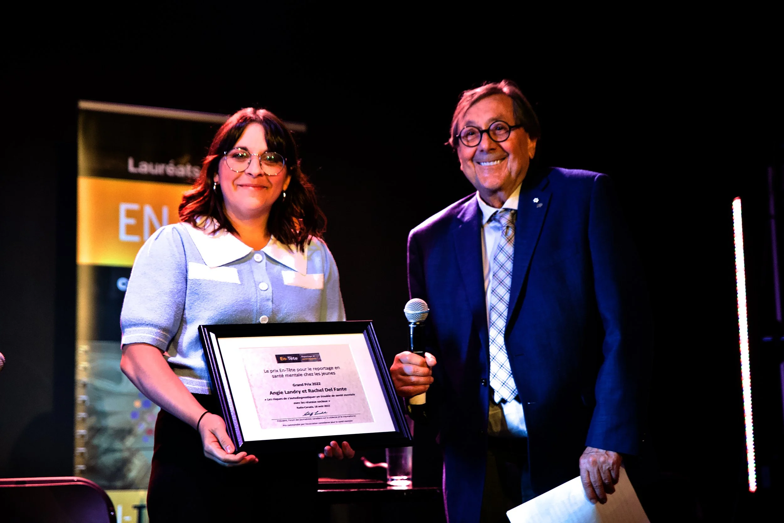 Six lauréats dans les deux catégories des prix En-Tête pour reportage en santé mentale en 2022 ont été célebrés à Montréal le 1er juin, recevant leurs certificates des mains de Raymond Saint-Pierre
